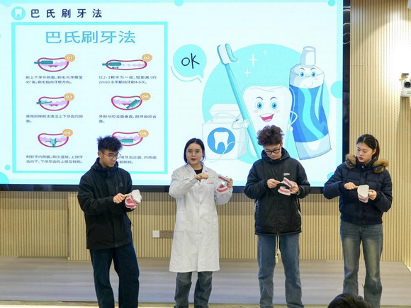 在随后的主题党日实践环节中,泉州医高专口腔医学院“熠心向牙”义诊队的师生发挥专业特长,为我校师生带来了一场别开生面的口腔健康服务活动。义诊队的学生通过图文并茂的讲座,普及龋齿防治、牙周健康等知识,并现场演示科学规范的“巴氏刷牙法”,强调日常口腔护理的重要性。