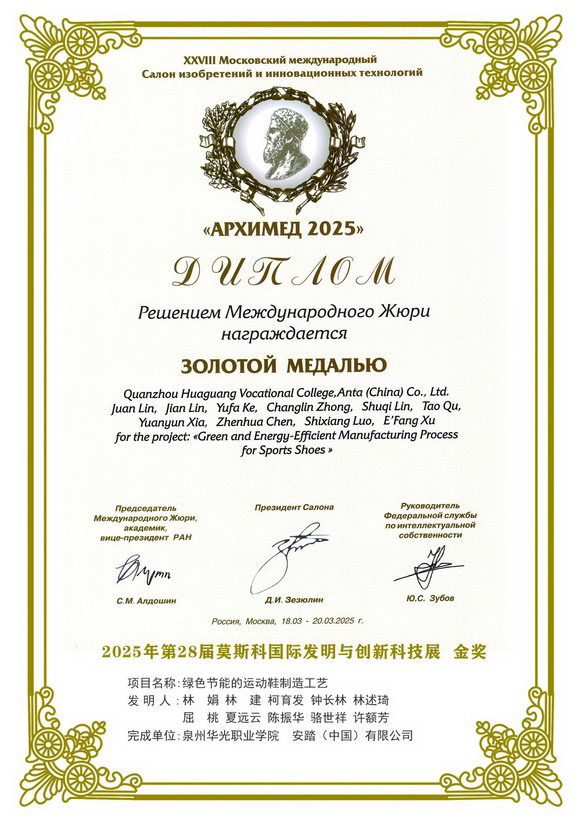 近日,从备受瞩目的“2025年第28届莫斯科国际发明与创新科技展览会”传来振奋人心的消息:由泉州华光职业学院与安踏(中国)有限公司强强联手打造的《绿色节能的运动鞋制造工艺》项目,凭借其卓越的技术创新力,一举夺得国际发明金奖。