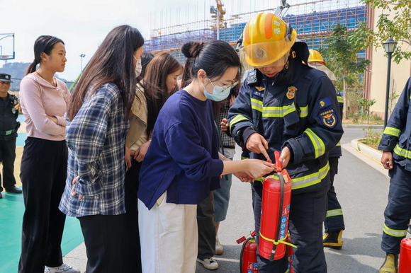 消防队随后邀请了师生上来体验灭火器的使用,让理论与实践相结合,更好地巩固了消防安全知识。