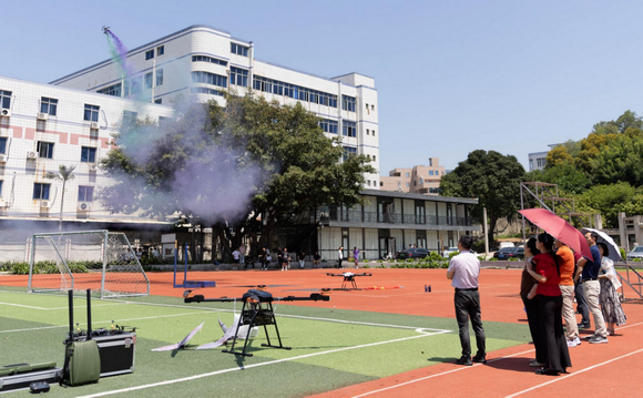 仪式后全体人员观看无人机五彩烟拖曳施放表演