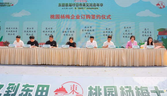 福建七匹狼实业股份有限公司等7家企业与桃园村签订杨梅采购协议。泉州华光职业学院与桃园村签订“大篷车移动式产教研共同体”产教融合赋能乡村产业振兴协议。