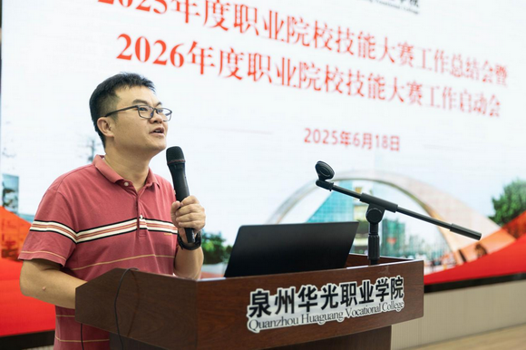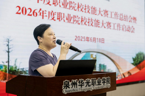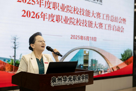 2025年6月18日下午,泉州华光职业学院2025年度职业院校技能大赛工作总结会暨2026年度职业院校技能大赛工作启动会在台商校区北区摄影大楼智慧教室召开。会上陈雅芳校长作动员讲话和工作部署、崔荫副校长做暑期集训工作部署。