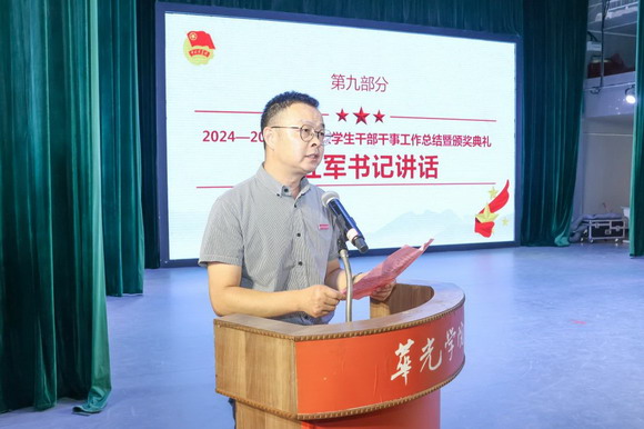 校党委书记吕红军作总结讲话。他代表学校党委向受表彰同学表示祝贺,向全体学生干部的辛勤工作致以敬意。吕书记殷切寄语全体学生骨干:一要坚定理想信念,筑牢思想根基;二要提升服务本领,发挥模范作用;三要勇于开拓创新,贡献青春智慧。他期望大家在新学年继续发扬优良传统,以更加昂扬的姿态、更加务实的作风,团结带领广大同学,为学校高质量发展贡献更加磅礴的青春力量。