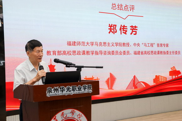 福建师范大学马克思主义学院教授、中央“马工程”首席专家、教育部高校思政课教学指导咨询委员会委员、福建省高校思政课教指委主任委员郑传芳教授作了题为《提高民办高校思政课教学质量》的报告,他结合自身丰富经验,针对民办高校思政课教学现状提出切实可行的改进建议,引发与会人员的深入思考。