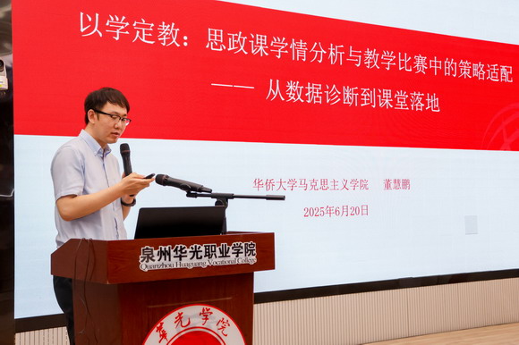 大会还邀请到第三届全国高校思想政治理论课教学展示活动特等奖获得者,来自华侨大学马克思主义学院的董慧鹏老师为参会教师分享思政课教学比赛经验,为大家拓展了备赛的宝贵思路。