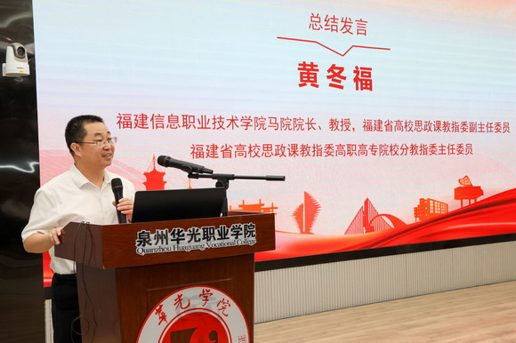 福建信息职业技术学院马院院长、福建省高校思政课教指委副主任委员、福建省高校思政课教指委高职高专院校分教指委主任委员黄冬福教授作总结发言,他对本次备课会的成功举办表示祝贺,对与会人员的积极参与表示感谢,强调了集体备课会对于推动民办高职院校思政课建设的重要作用,希望与会人员将本次备课会的成果运用到实际教学中,不断提升教学质量。