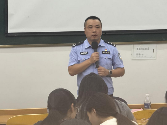 随后,紫山派出所王所长结合近年来校园内学生被诈骗的案例以及短视频的趣味宣传视频,深入剖析了冒充公检法、网络刷单、虚假购物、游戏交易诈骗等典型案例,揭示了诈骗分子的作案手法和心理套路,为同学们上了一堂生动有趣的反诈宣传课。同时他强调:“诈骗手段不断升级,但万变不离其宗,同学们务必牢记‘不轻信、不透露、不转账’的‘三不原则’。”