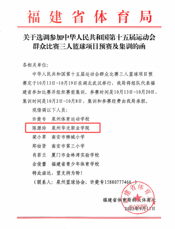 近日,一则喜讯传来,泉州华光职业学院体育学院陈源玲老师光荣受邀,入选福建省代表队,将出征中华人民共和国第十五届运动会(简称:全运会)群众比赛三人篮球项目,届时将与国内多支优秀球队同台竞技。这不仅是我院教师个人的崇高荣誉,更是我院体育事业蓬勃发展与师资队伍建设成果的生动体现。