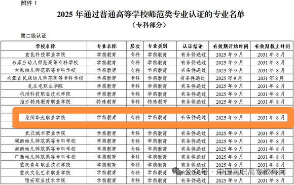 近日,教育部办公厅公布《2025年通过普通高等学校师范类专业认证专业名单及中期审核专业名单的通知》(教师厅函〔2025〕18号),泉州华光职业学院学前教育专业顺利通过普通高等学校师范类第二级认证,认证有效期六年。我校是本次全国参与认证的唯一民办高职院校,也是全国首家获此认证的民办高职院校,标志着我校学前教育专业办学质量迈入国家第一方阵。