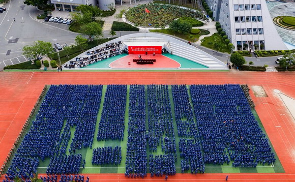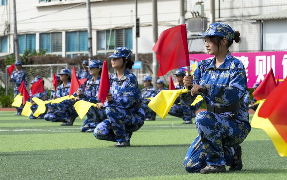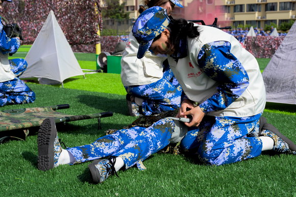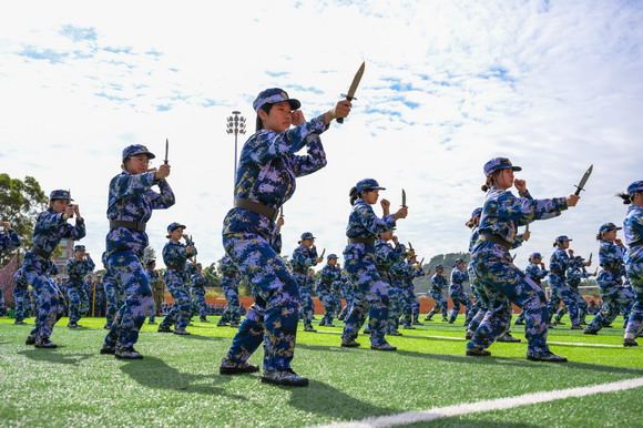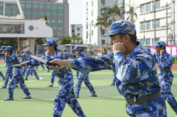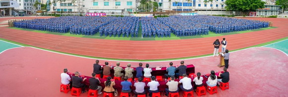 惠安校区同步进行,上尉指导员黄友宾、苏成安副校长与健康管理学院和工艺美术学院领导一同检阅35个方阵。虽然没有看台,但田径场四周被同学们围得水泄不通——分列式步伐铿锵、匕首操杀声震天,展现了华光学子豪情壮志。