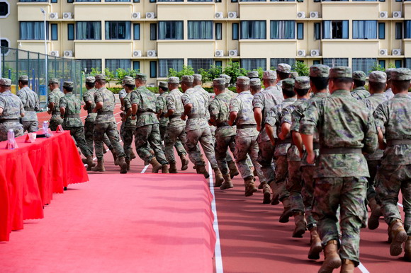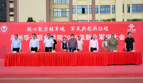 台商校区操场上空回荡着雄壮的《运动员进行曲》,操场中央巨幅标语“凝心聚力铸军魂,军民共赴新征程”格外醒目。主席台上,73141部队政治工作部副主任黄华、上尉指导员胡添宇与我校吴华轩理事长、陈雅芳校长、王巧萍书记等校领导共同检阅方阵。