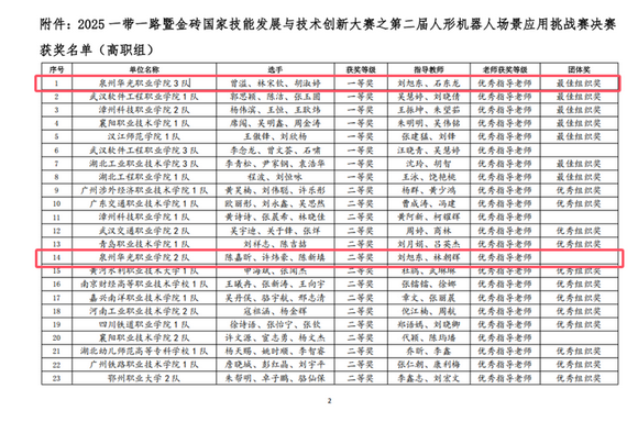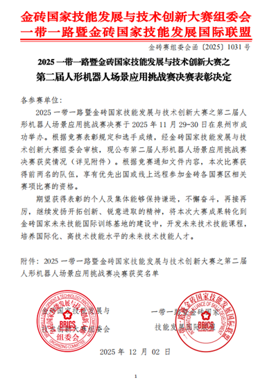 在刚刚落幕的2025年“一带一路”暨金砖国家技能发展与技术创新大赛第二届人形机器人场景应用挑战赛决赛中,泉州华光职业学院商学院代表队凭借出色发挥,以精湛的技术实力与卓越的团队协作,一举斩获全国一等奖第一名(高职组冠军),并成功取得晋级国际赛的资格,为国赛征程画上圆满句号,也为学校赢得了荣誉!