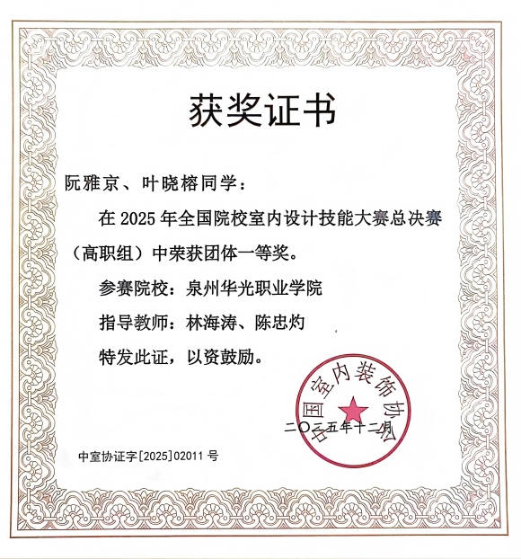 经过八小时的比拼,泉州华光职业学院·科技与工程学院建筑室内设计专业阮雅京、叶晓榕两位同学在全国三百名选手中脱颖而出,以高湛的技艺荣获一等奖,值得祝贺的是泉州华光职业学院已连续三年在该大赛中摘取一等奖。
