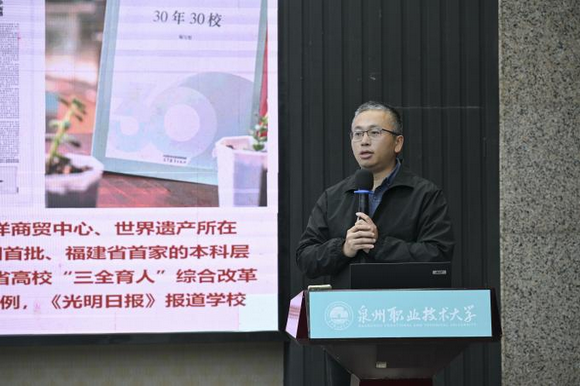 在专题座谈会上,泉州职业技术大学党委书记傅志雄对我校一行的到来表示热烈欢迎,泉州职业技术大学党委组织部部长黄镇红围绕学校党建工作成效与经验作专题分享。