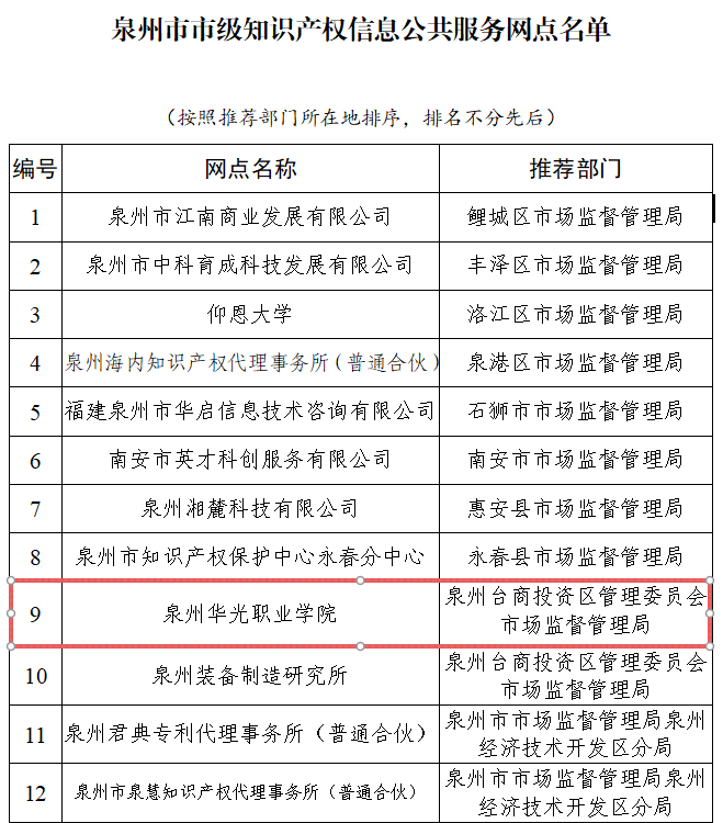近日,泉州市市场监督管理局发布《关于公布泉州市市级知识产权信息公共服务网点名单的通知》,经公开申报、属地县局初审推荐、市局复核及公示等多轮评审,泉州华光职业学院凭借扎实的服务基础、专业的资源配置及清晰的服务规划,成功获批泉州市市级知识产权信息公共服务网点。