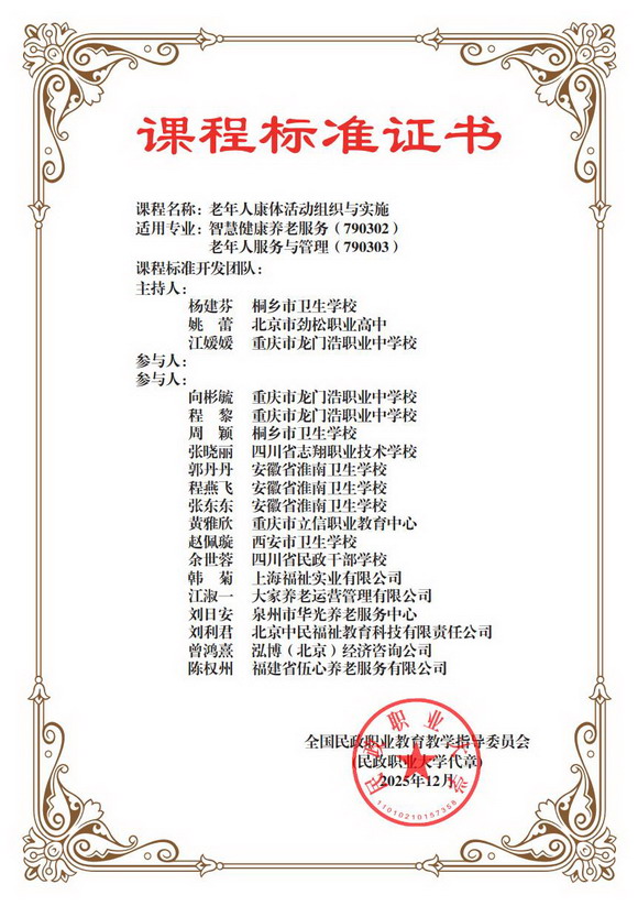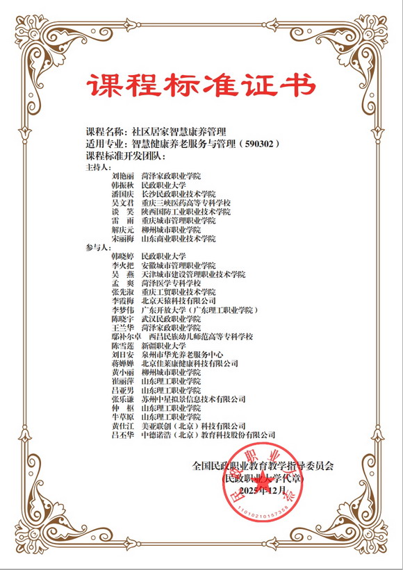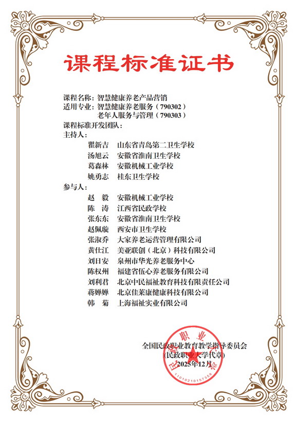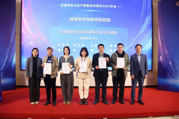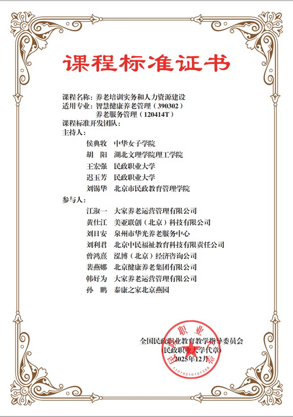 全国养老行业产教融合共同体2025年会日前在山东泰安召开,我校产教融合促进中心、华光养老服务中心刘日安主任应邀参会。全国民政职业教育教学指导委员会在会上正式发布了智慧康养专业系列中职9门、高职13门、本科10门课程标准,刘日安老师参与中职《老年人康体活动组织与实施》《智慧健康养老产品营销》,高职专科《社区居家智慧康养管理》《养老机构智慧运营与管理》和职业本科《养老培训实务和人力资源建设》等五门课程标准的编写工作,经专家审核通过圆满完成并获颁证书,体现了我校在全国智慧康养教育方面的成就与贡献。