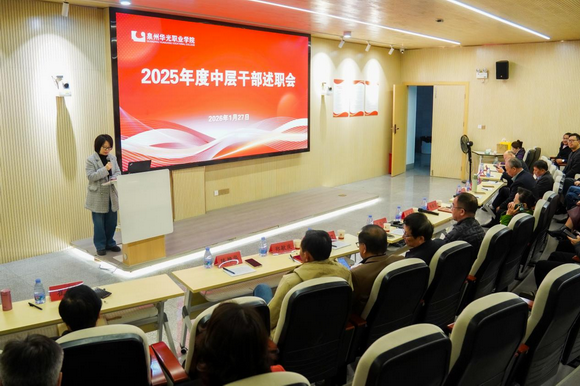 为全面加强干部队伍建设,系统总结“十四五”发展经验,科学谋划“十五五”开局,推动学校内涵式高质量发展,2026年1月27日,泉州华光职业学院在摄影大楼智慧教室召开2025年度中层干部述职大会。会议由党委书记王巧萍主持,全体理事会成员、校领导及中层干部参加会议。