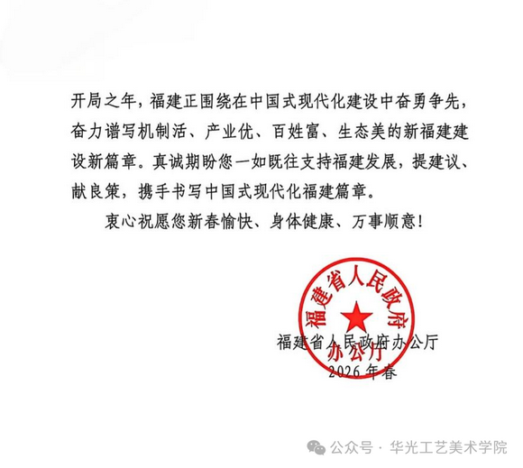 2026年新春佳节前夕,我校迎来暖心时刻。福建省省长赵龙委托省政府办公厅,专程向泉州华光职业学院工艺美术学院教授、省文史馆员常跃中发出新春慰问信,转达省政府的诚挚关怀与节日问候。